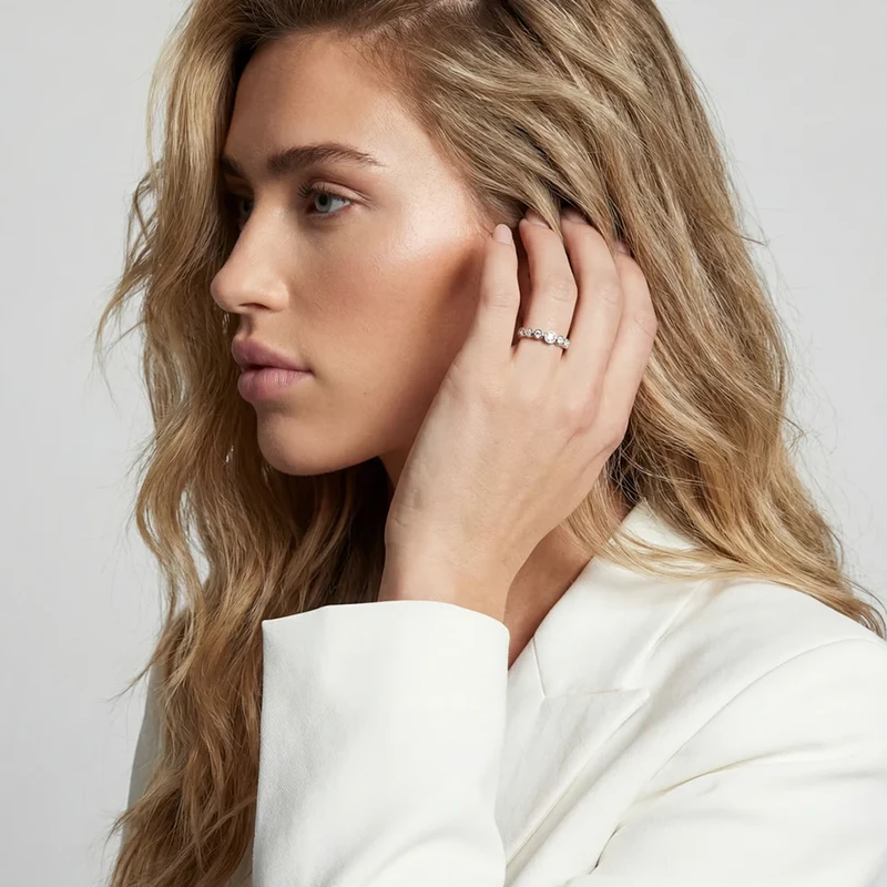 Ring i rodiumpläterat 925 Sterling Silver med polerad yta och handfattade, fasettslipade vita zirkoner.